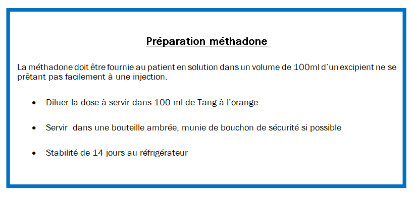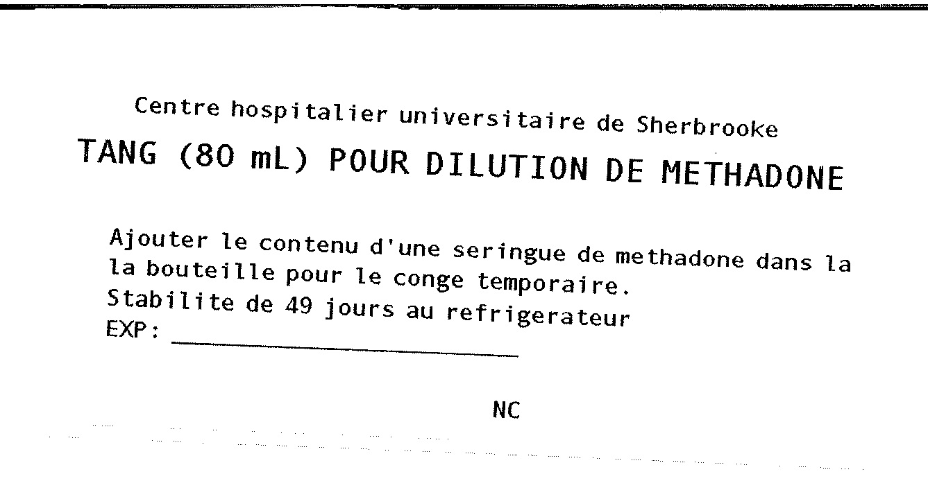 Modifier les instructions de la méthadone pour ajouter: POUR CONGÉ TEMPORAIRE DOIT ÊTRE DILUÉ DANS JUS TANG. AVISER LA PHARMACIE