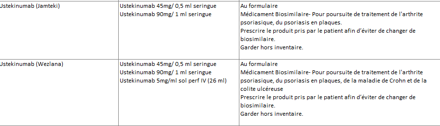 Je me fierais à ce que l'on retrouve dans la monographie.L'autre nouveau biosimilaire a été approuvé le 16 dec au comité pharmaco. Demandes à venir ! Pour le Stellara je le retirerais complètement.