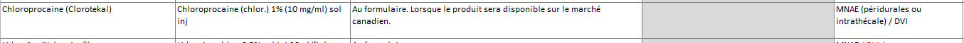 MOdifier la chloroprocaine (Nesacaine) pour du 1% (Clorotekal et retirer les restrictions inscrites. Non nécessaire de coder "lorsque le produit sera disponible sur le marché canadien ( je l'enleverai dès que ce sera dispo) SVp mettre mention DVI
