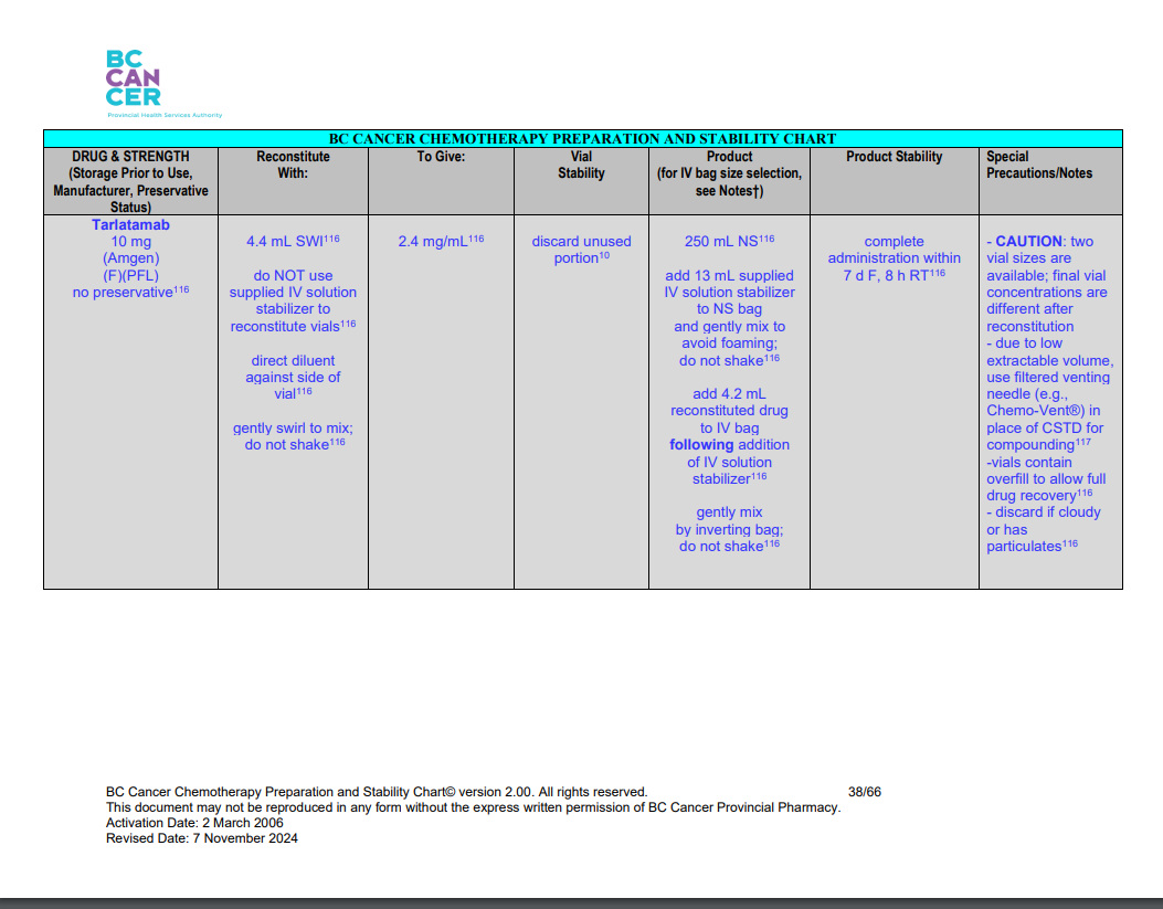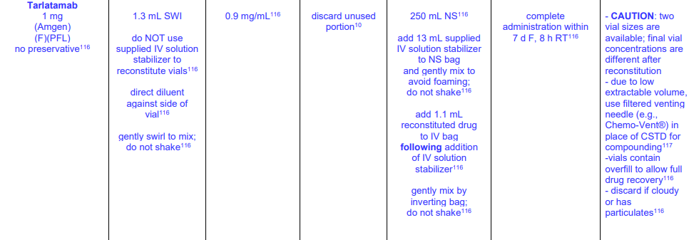 Il faudrait que ce soit en additif au produit donc peut être le codé comme le blina : 250 mL/h x 1 h commencer le ___ en mode perfusion pour avoir NS + tarla + stabilisateur.