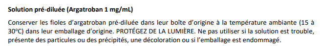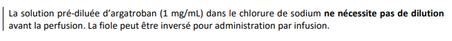 L'argatroban sera maintenant disponible en format de 1mg/ml fiole de 50 ml. Il n'y aura plus de préparation à faire car elle sera prête à l'emploi. Il suffira de l'inverser et de l'administrer avec une tubulure ventilée comme pour l'altéplase. Donc à retirer du tableau SCAS et modification du 12B et pompe ?. Il faudra s'arrimer ensemble pour que tout soit finalisé en même temps lorsque nous aurons écoulé nos stocks.