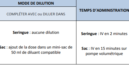 Ne sera pas redilué la majorité du temps. Vont juste rediluer si le volume est trop petit. Donc IV en 15 min à 4mg/ml serait ok