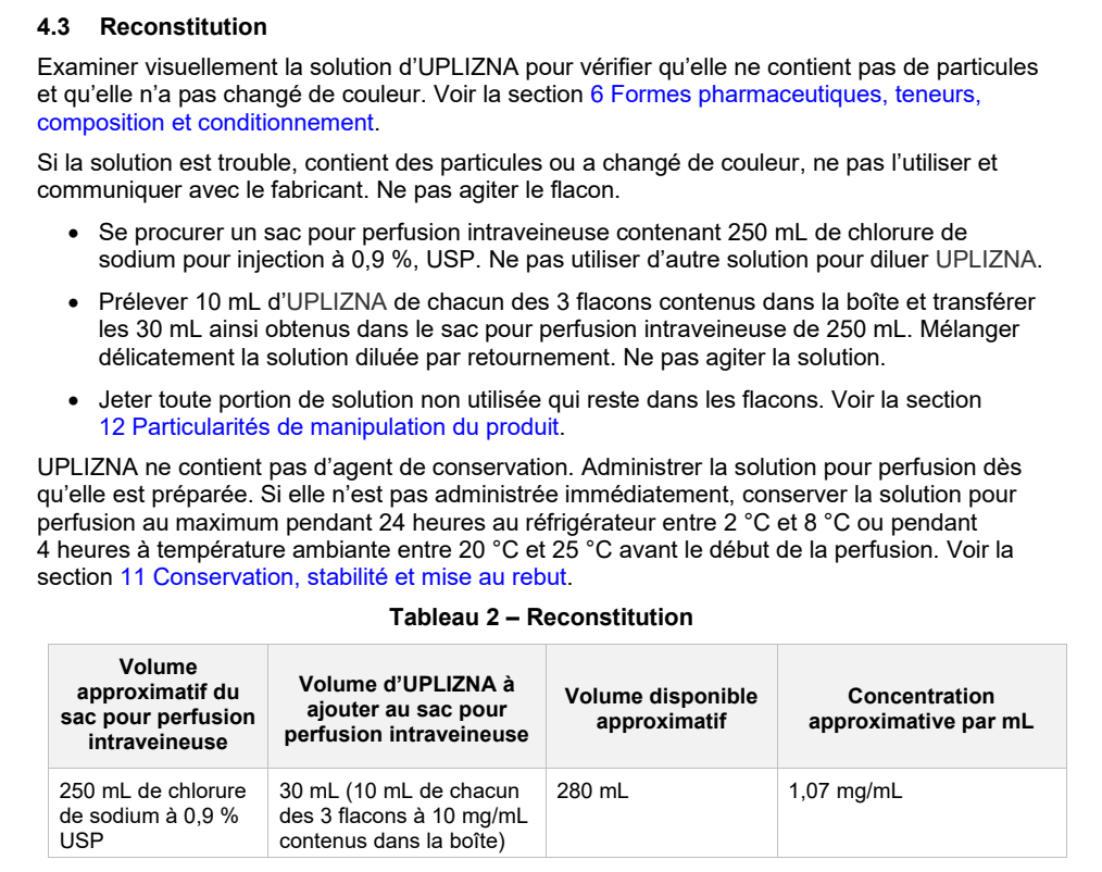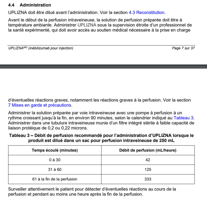 Perfuser par voie intraveineuse en environ 90 minutes, selon les débits de perfusion ci-bas :